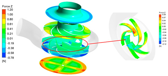 Figure 12 illustrates that the absolute values of axial forces on the outer surface of the impeller front cover plate exhibit an increasing trend with an expanding cross-sectional radius. The axial force values in the central region of the impeller exhibit a concentric circular distribution, being lower than those at the outer edge. Similarly, the distribution of axial forces on the inner surfaces of the impeller front and rear cover plates conforms to the same pattern. The axial force at the impeller inlet is the smallest, gradually increasing from the inner diameter to the outer diameter along the impeller flow passage. Near the impeller outlet, the maximum axial force is attained in proximity to the blade pressure surface. The outer surface of the impeller rear cover plate demonstrates axial symmetry, with the minimum axial force value located at the center of the outer surface within the 0–90° region (1/4 circle) of the impeller rear cover plate. Along the centerline, the axial force gradually increases from the inner diameter to the outer diameter. The axial forces on the blades are comparatively smaller than those on the impeller cover plates. The blade suction surface experiences the maximum downward axial force, likely attributed to the impact of the incoming water flow on the blades. The blade pressure surface undergoes the maximum upward axial force near the inlet, with the axial force gradually diminishing along the outlet due to the decreasing pressure gradient.
