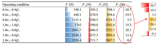 By conducting unsteady numerical simulations, the axial force (F) for three operating conditions, namely, 1.0nr-1.0Qr, 1.0nr-0.8Qr, 1.0nr-0.6Qr, 1.0nr-0.4Qr, and 0.8nr-0.8Qr, 0.6nr-0.6Qr, 0.4nr-0.4Qr, was determined and is presented in Figure 13.