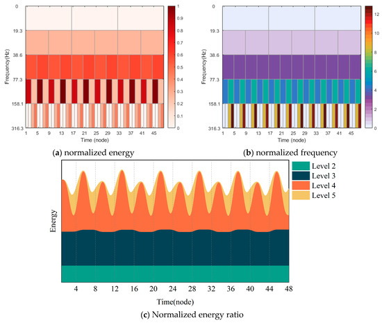 To facilitate a clear analysis of the transient variations in the axial force field of the impeller, the energy values of the axial force field were normalized by subtracting the average flow field. Furthermore, the frequency values were normalized by comparing them with the rotational frequency. In order to achieve a suitable level of time–frequency resolution, the number of levels was determined as , with the current frequency at the terminal level truncated to 55. The relevant time nodes were set at 48, which corresponds to 3 × 24.