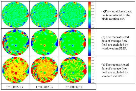 To evaluate the performance of the wmrDMD model, a comparison was conducted between the data-driven model and the original axial force field of the centrifugal pump impeller. The results showed that the error of the wmrDMD model was less than 2.49% for all pixels and time points, indicating its high accuracy in reconstructing the axial force field.