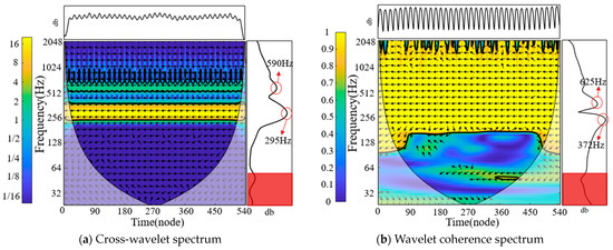 Cross-wavelet transform and wavelet coherence analysis are useful tools for examining the correlation, delay, and phase structure between different signals. In the context of this study, these analyses focused on the relationship between the axial forces on the front and back cover plates within the high-energy region of the time-frequency domain. The figure provides visual representations of these analyses.
