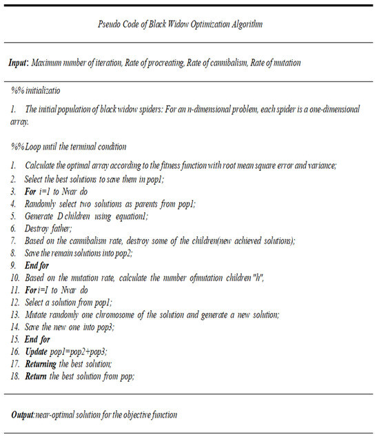 - Hayyolalam, V.; Kazem, A.A.P. Black widow optimization algorithm: A novel meta-heuristic approach for solving engineering optimization problems. Eng. Appl. Artif. Intell. 2020, 87, 103249. [Google Scholar] [CrossRef]