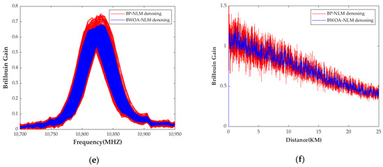 - Through a series of field tests, it was verified that the proposed method had better advantages than the BP-NLM algorithm in terms of detail preservation and noise suppression. The BWOA-NLM algorithm improved the Signal-to-Noise Ratio of the BGS by 11–12.9 dB, and, compared to the BP-NLM algorithm, the BWOA-NLM algorithm still maintained a level of 10.3 dB for the BGS Signal-to-Noise Ratio at the fiber end (25 km), which was about 3 dB higher than that of the BP-NLM algorithm.