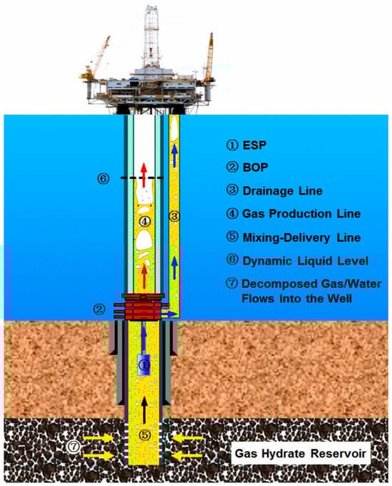 Currently, various methods of exploitation, such as depressurization, solid fluidized mining, thermal stimulation, and the injection of chemical additives, are being proposed to exploit natural gas hydrates [,,,,]. By continuously supplying artificial heat to the hydrate reservoir, thermal stimulation is utilized to modify the reservoir’s thermodynamic conditions and consequently provoke the dissociation of hydrates []. The method of injecting chemical additives aims to shift the hydrate’s phase equilibrium and achieve hydrate dissociation under local pressure–temperature conditions [,]. Among these methods, the depressurization method presents great development potential due to its economical and effective advantages and has been successfully used in record production tests conducted by the China Geological Survey [], as illustrated in Figure 1. In this method, a downhole electric submersible pump in the production well is utilized to reduce the pressure of the hydrate reservoir close to the wellbore. The pressure variation causes the dissociation of the solid hydrate, resulting in the production of gas [,,]. On the one hand, a controllable pressure difference is crucial to maintaining stable and efficient production. Real production commonly involves fluctuating production rates of gas and water []. On the other hand, in real production systems, a multiphase, multicomponent flow composed of soil particles, hydrate particles, gas, and water can remarkably influence the reservoir and wellbore pressure [,]. During production, the flow system is simultaneously accompanied by the growth, fragmentation, and aggregation of hydrate particles [,]. Therefore, an understanding of gas–liquid–solid multiphase flow characteristics coupled with the nucleation and growth kinetics of hydrate particles is crucial for developing a controllable technique of exploiting natural gas hydrates.