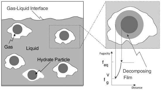 An illustration of the mechanism of the dissociation of a hydrate in abulk system [,]. The driving force of the dissociation is defined as the difference, feq-feqv, between the fugacity of the gas at the equilibrium (feq) and the fugacity of the gas at the solid surface (feqv).