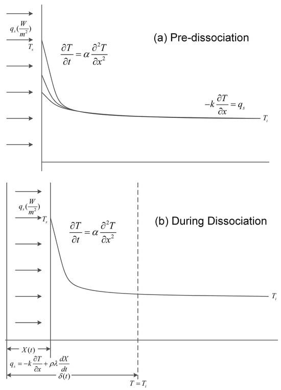 Another classical dissociation model considering thermal stimulation was proposed by Selim and Sloan []. The distribution of the hydrate in the porous media is seen as a one-dimensional and planar, semi-infinite system with constant physical properties, as illustrated in Figure 3. Initially, a constant heat flux is imposed on the hydrate’s surface to increase its temperature to the equilibrium temperature. Subsequently, dissociation happens with a moving front along the positive x direction, and the moving surface is constantly maintained at the equilibrium temperature. With an assumption that the formed water phase is fully removed during dissociation due to gas purging, the dissociation of the hydrate is simplified into a problem of moving-boundary ablation at a constant heat flux, and heat transfer with constant physical properties is considered for the hydrate bulk. The system is consequently divided into two regions, namely the dissociated region containing the water and gas phases as well as the undissociated region containing the solid hydrate. Based on the measurements, the reliability of the Selim–Sloan model has been validated []. Although the intrinsic dissociation kinetics and mass transfer are neglected, the Selim–Sloan model provides a feasible method for studying heat transfer within the porous media and dissociation front.