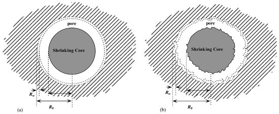 Subsequently, various dissociation kinetic models were developed considering dissociation mechanisms []. By coupling the Kim-Bishnoi model and the Selim–Sloan model, Jamaluddin et al. [] developed a kinetic model which considers both heat transfer and the intrinsic kinetics. Following the Kim–Bishnoi model, the dissociation rate of the hydrates was defined in the form of the intrinsic kinetic rate, which was coupled with the heat transfer solution, following the Selim–Sloan model. This model guided the coupling of different dissociation regimes. For the first time, Yousif et al. [] developed a one-dimensional, three-phase model for the production of gas using a depressurization approach which significantly considers the flow of the fluid in porous media by embedding Darcy’s equation into the mass and energy equations. Linearization and iterative solutions were carried out for these nonlinear conservation equations. Significantly, Hong et al. [,] proposed a simple analytical model for the dissociation of a hydrate in porous media using the depressurization method. Referring to the real conditions of a hydrate reservoir, three primary regimes, including heat transfer, fluid flow within the porous media, and intrinsic dissociation kinetics, were comprehensively considered in this model []. Heat transfer in the hydrate region was treated as a melting boundary problem. The intrinsic dissociation kinetic was solved following the Kim–Bishnoi model. The gas–water two-phase flow within the porous media was incorporated using Darcy’s law. At the dissociation interface, a mass balance was employed to implement the coupled solution. Recently, considering the self-similarity characteristics of the porous sediment, Li and Zhang [] used a fractional number to define the irregular geometry of the hydrate particles and proposed a fractional shrinking-core model which referred to a shrinking-core dissociation process of the hydrate in the porous media, as illustrated in Figure 4a,b. One significant feature of this model is the introduction of a fractal analysis which can eliminate mathematic iteration and self-replication.