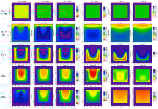 The spatial distributions of the pressure P, temperature T, and phase saturation (SH for the hydrate phase, SA for the aqueous phase, and SG for the gas phase) over time [].