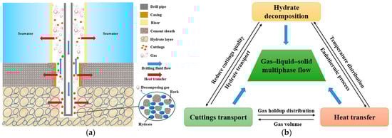 Well drilling in hydrate−bearing sediments is of great importance for the development and exploitation of gas hydrates [,]. Similar to the dissociation of hydrates in sediments, the drilling process also involves complex multiphysics coupling [], as illustrated in Figure 6. Different phases, including sediment particles, hydrate particles, gas, and water, form a multiphase flow in the wellbore. Due to the specific environmental conditions, the hydrate particles in the flow system present complex dynamics, including growth, dissociation, aggregation, and fragmentation. The transport of heat, mass, and momentum between phases commonly occurs during the drilling process. Therefore, the multiphase flow in the wellbore is coupled with the complex dynamics of the hydrate particles as well as heat, mass, and momentum transport. Understanding such a complex multiphysics coupling problem plays a crucial role in achieving the controllable exploitation of gas hydrates through drilling.