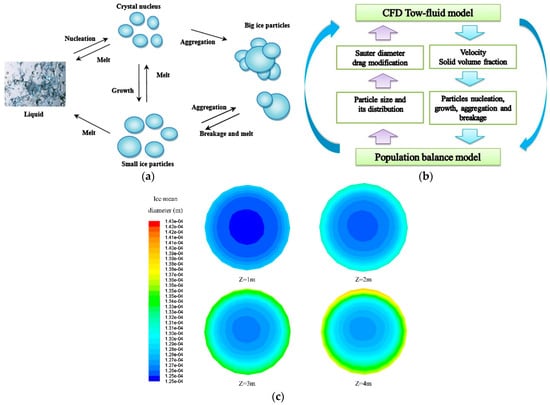 The CFD-PBM approach for the flow of ice slurry in horizontal pipes: (a) a schematic of the particle dynamics of hydrates; (b) the coupled framework of the CFD-PBM model; (c) the mean size contours of ice on distinct cross-sections along the flow direction (z is the axial distance) [].
