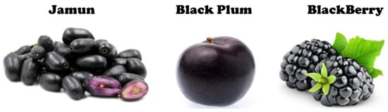Jamun, black plum, and blackberry fruits from which dye was extracted for the study.