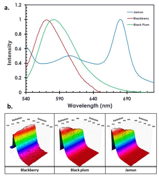 Fluorescence of different natural dyes extracted from jamun, black plum, and blackberry. ((a) 2D spectra; (b) 3D spectra of blackberry, black plum, and jamun fruit dyes).
