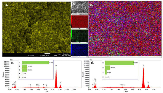 FESEM image of jamun-sensitized TiO2 (a) with its elemental mapping analysis (b) and the energy dispersive X-ray analysis of jamun-sensitized TiO2 (c) and bare TiO2 (d).
