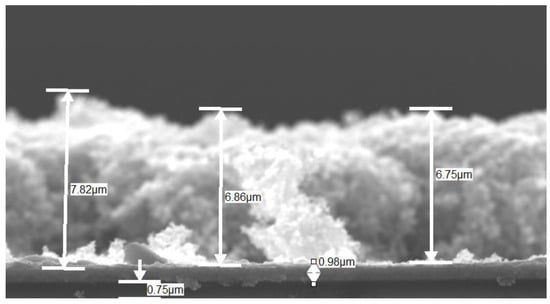 The TiO2-coated FTO glass was further characterized via FESEM cross-sectional imaging. The performance of DSSC is influenced by the thickness of the TiO2 film [65]. The cross-sectional image, as displayed in Figure 8, reveals the thickness of the TiO2 film on the FTO glass. The average thickness of the TiO2 layer was estimated at 7.14 µm. This thickness allows for the smooth transport of charge.