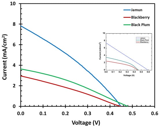 Current and voltage measurement of DSSCs fabricated with natural dye extracted from jamun, black plum, and blackberry under 1 sun illumination at 100 mW/cm2. Inset: current vs. voltage graph of the three DSSCs from the simulation study.