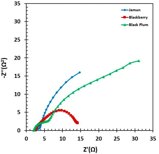 Nyquist plot of DSSCs fabricated with dyes extracted from jamun, black plum, and blackberry fruits.