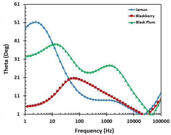 Bode plot of DSSCs fabricated with dyes extracted from jamun, black plum, and blackberry fruits.