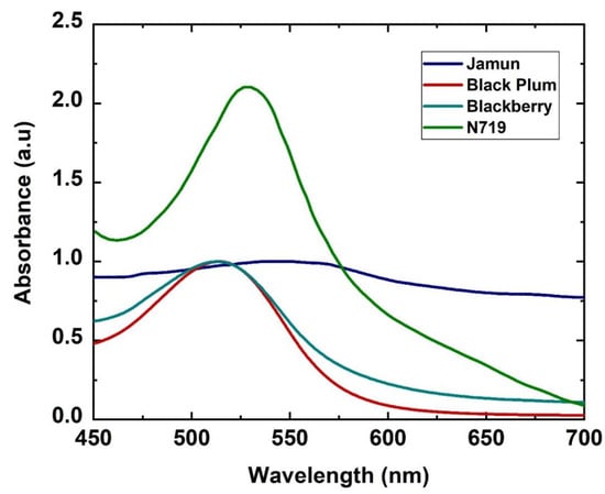 In Figure 12, we compare our three natural dyes’ absorbances with the N719 dye [75]. From the 450 to 575 nm region, the N719 dye possesses high absorption of incident light compared to the jamun, black plum, and blackberry dyes. N719 dye-sensitized TiO2 resulted in a photovoltaic PCE of 6.45% due to its high absorbance [75] while the poor absorbance intensity of our three natural dyes is also a reason for the low PCE in our experiment.