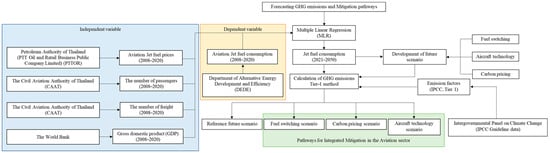 This study employs a comprehensive framework, as depicted in Figure 1, to forecast medium-term (2030) and long-term (2050) GHG emissions in Thailand’s commercial domestic aviation sector. The forecasting of GHG emissions is based on key factors such as the number of passengers, freight, gross domestic product (GDP), and jet fuel price.