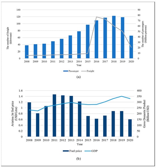 The historical data of four-factor variables related to the growth in GHG emissions. (a) The number of passengers and the amount of freight 2008–2020. (b) Aviation Jet fuel price and GDP 2008–2020.