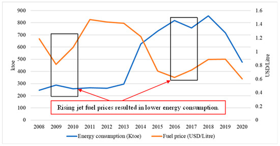 Carbon pricing mechanisms, such as cap and trade or direct taxation systems, can impact fuel use and CO2 emissions. As the price of carbon increases, the effective fuel price also rises, leading to a reduction in consumption due to the demand–price relationship. Hasan et al. [33] anticipated that increasing the high carbon price could result in a 12% reduction in overall emissions, equivalent to 180 MtCO2 of emissions in the mitigation pathway. To estimate the price elasticity of fuel demand, income elasticities were used to adjust the price elasticity. Hasan et al. [33] estimated that price elasticity of fuel demand is −0.48, indicating that a 10% increase in price will result in a 4.8% decrease in demand. This relationship demonstrates the responsiveness of fuel consumption to changes in price. In Thailand’s domestic aviation sector, this study examined the change in demand for fuel consumption and aviation jet fuel prices during 2009–2010 and 2016–2017. Figure 3 illustrates the relationship between jet fuel price increases and the corresponding change in demand for fuel consumption. The jet fuel prices increased and had an impact on decreased demand twice: first, between 2009 and 2010, when jet fuel prices increased by around 12%, resulting in an average 6% decrease in demand; and second, between 2016 and 2017, when jet fuel prices increased by around 7%, resulting in an average 4% decrease in demand. Therefore, the results show that the average increase in jet fuel prices in both periods was 10%, resulting in an average 4.9% decrease in demand. Based on these observations, the study assumes an annual increase in jet fuel prices by 10% from 2021 to 2050 will result in a 4.9% decrease in fuel demand. This assumption reflects the anticipated impact of carbon pricing on fuel consumption in the domestic aviation sector.