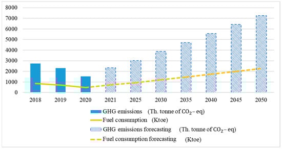 In parallel, jet fuel consumption in Thailand’s domestic aviation sector witnessed a notable increase, rising from 246 kilotonnes of oil equivalent (ktoe) in 2008 to 856 ktoe in 2018 [47]. It is noteworthy that Thailand’s Nationally Determined Contribution (NDC) sets a greenhouse gas reduction target of 20–25% lower than the Business-As-Usual prediction for 2030 across all sectors [48]. Furthermore, during the UNFCCC’s COP-26 in Glasgow, Thailand committed to achieving carbon neutrality by 2050 and net-zero emissions by 2065. It indicates that Thailand’s domestic aviation sector can align with its climate commitments even during growth. However, medium-term to long-term GHG emissions forecasting and policies to reduce future emissions in the domestic aviation sector have yet to be developed and implemented. These observations highlight the need for comprehensive GHG emissions forecasting and the implementation of policies to reduce emissions in the domestic aviation sector to align with Thailand’s climate targets.