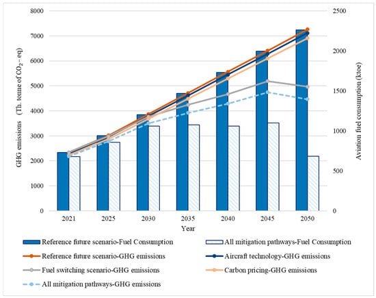 Additionally, new engines and auxiliary power units (APUs) are expected to consume at least 15% less fuel than the aircraft they replace. These improvements are made possible through innovations in engine technologies, including materials, coatings, combustion methods, sensors, and cooling methods [70]. Based on the ICAO target, this study assumes that aircraft technology will continue to improve fuel efficiency by 2% annually from 2021 to 2050. This assumption reflects the ongoing efforts and advancements in aircraft design and technology to achieve greater fuel efficiency and reduce CO2 emissions.