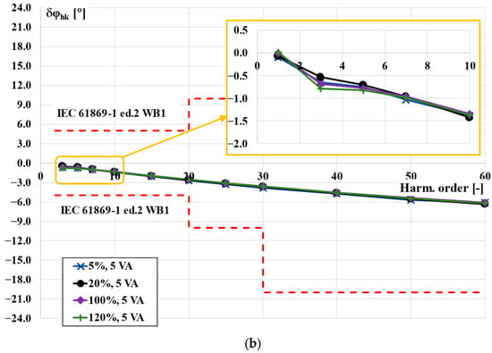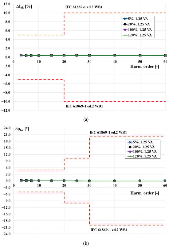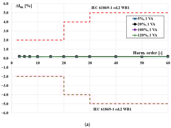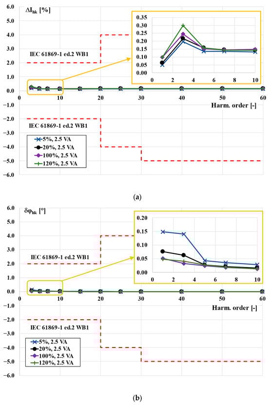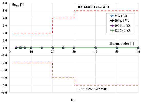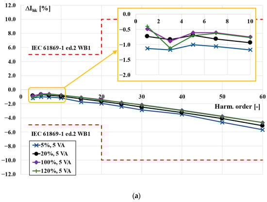 Twenty-five percent of the rated load of the TCT was equal to 1.25 VA. Therefore, in accordance with the interpretation sheet IEC 61869-2:2012/ISH1:2022, the power factor of the load used was equal to 1 []. In this case, the increase in the values of the current error and phase displacement with the order of transformed higher harmonic was not detectable. The requirements of the WB1 optional accuracy class were also fulfilled with a greater reserve. Taking into consideration the results presented in Figure 2 and Figure 4, the accuracy class of the TCT was determined to be 0.5-WB1.