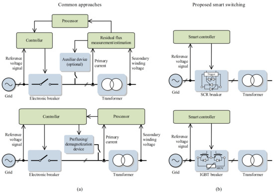 Flowcharts of (a) common approaches for inrush current reduction and (b) the proposed smart switching for inrush current elimination.