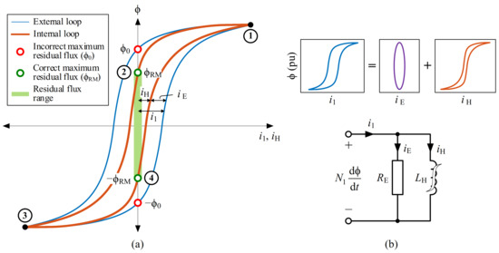 The only way to characterize the residual flux is with a hysteretic core model [46], i.e., a model with a memory-like effect or a storage-like effect. The most common ones are Jiles–Atherton (JA) and Preisach. A correct hysteretic core modeling must include the following components (Figure 4b):