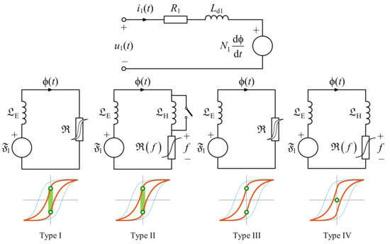 - Type III. Hysteretic reluctance 𝕽 can only reproduce a unique and rigid major loop [48]. Inevitably, this model can only lead to the maximum or minimum residual flux values;
