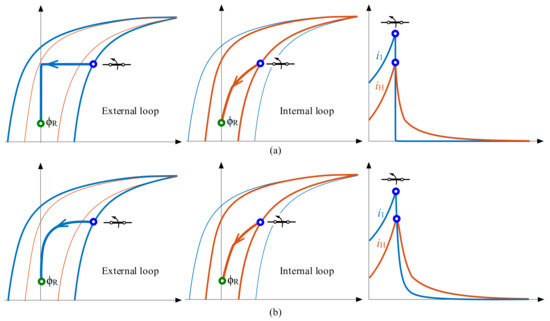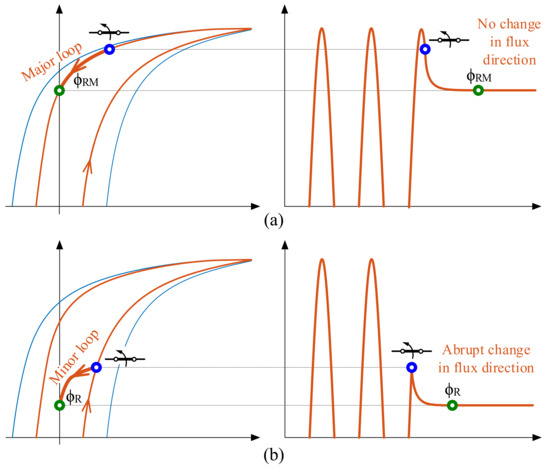 Figure 6 illustrates two representative de-energization transient trajectories. Let us now consider that the circuit breaker aperture starts at the instant marked with a blue circle in Figure 6a. The flux trajectory follows the major loop illustrated in the figure until the residual flux reaches the value ϕRM. Note that only the internal hysteresis loop has been taken into account because the eddy losses do not influence the achieved residual flux.
