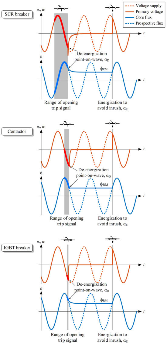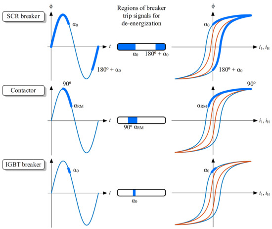 Finally, the trip signal of the SCR breaker can be sent at any instant because there are only two possible de-energization points-on-wave (see Figure 8). As a consequence, residual fluxes −ϕRM and ϕRM will always be achieved.