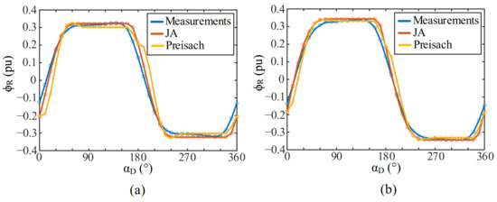 In all simulations, the circuit breaker is supposed to be ideal (close to the behavior of the IGBT breaker). Figure 12 shows the residual flux values as a function of αD, obtained from JA and Preisach simulations, as well as the values estimated from the experiments. There is close agreement between experiments and simulations, and the results validate the presented analyses of the residual flux and the de-energization trajectories.