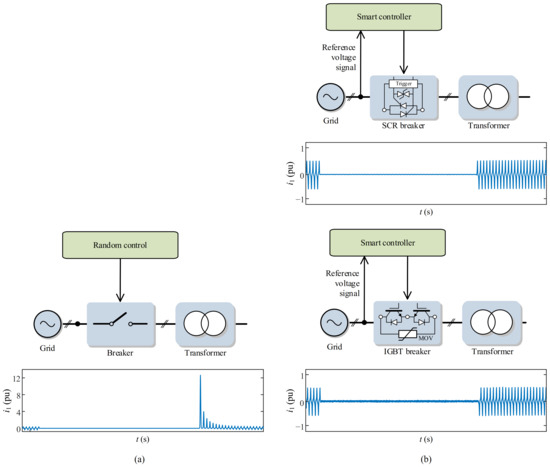 Experimental setups of (a) common approaches for inrush current reduction and (b) the proposed smart switching for inrush current elimination.