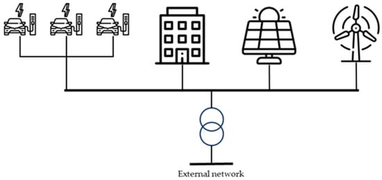 It is assumed that every RES power plant can exchange both active and reactive power in accordance with its capability curve, which is characterized by the shape of a semi-circle in the first two quadrants of the plane, with the reactive power on the horizontal axis and the active power on the vertical axis. Charging points for EVs work at a unitary power factor. Reactive power can be exchanged by the microgrid with the distribution network, thus enabling the transformer to operate in the four quadrants of the reactive/active power plane. The building does not present manageable loads apart from the EV charging points, whose scheduling can be optimized via the EMS. As further described in Section 2.2, the main goal of the EMS is that of managing RES power plants and EV charging points in order to minimize global Net Costs (NCs) and reduce the curtailment of RES sources. Among the costs, one is represented by the penalties related to the reactive power absorbed from the distribution network; to minimize this term, the role of inverters of RES plants in providing inductive reactive power is investigated.