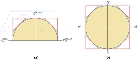The relative constraints are defined from (1) to (2). The energy balances (1) set that the active power available from each RES plant is given by the sum between the generated power and the curtailed one, while constraints (2) guarantee that the maximum curtailed power is the available one. Constraints from (3) to (7) are defined to linearize the circular capability curve of inverters in the active power/reactive power plane, as shown in Figure 2a. The operating points lay in the ochre-colored area. In particular, constraints (3) and (4) fix the upper bounds of the inductive reactive power (absorbed and supplied) as a function of the rated apparent power , whereas constraints (6) and (7) represent the two tangents to the capability curve, respectively, in the first and in the second quadrants at the points of coordinates ( and (. The set of binary variables and is introduced to avoid the simultaneous absorption and supply of inductive reactive power at time t, as ensured by constraints (5).