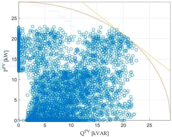 PV inverter capability curve. Blue circles represent the hourly operating points of the inverter. The red circular line represents the non-linearized capability curve of the inverter. The yellow line represents the sloped portion of the linearized capability curve of the inverter.
