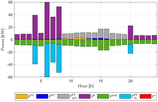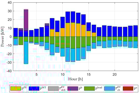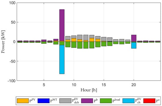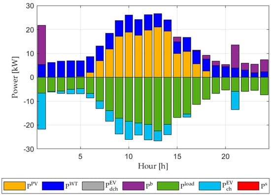 Figure 5, Figure 6, Figure 7 and Figure 8 show the optimal active power profiles determined using the EMS for the selected days. In these figures, the power associated with EDVs is considered positive when the vehicles are in discharge mode, whilst the charging of the EDVs is considered as a load and, therefore, associated with negative values.