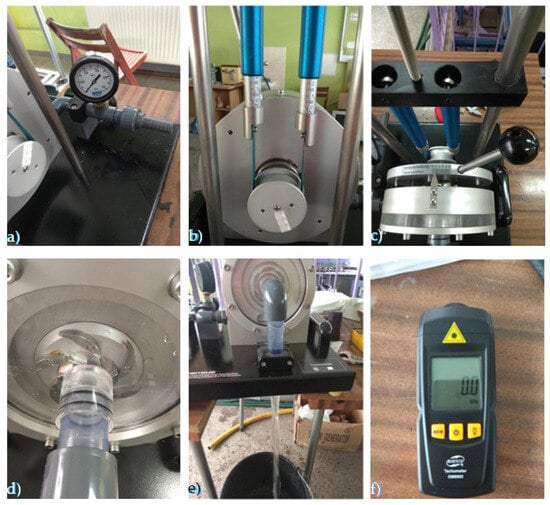 Turbine rotational speed was measured using a Benetech GM8905 (Benetech Poland, Kalisz, Poland) laser tachometer (Figure 2f) pointed at the rotating shaft. The instrument makes measurements in the range of 2.5–99,999 rpm. The measurement error is 0.1% in the 2.5–999.9 rpm (resolution 0.1 rpm) and 1% in the range of 1000–99,999 rpm (resolution 1 rpm). The sampling time is 1 s, and the laser power is 2–5 mW [43]. The error of the laboratory measuring equipment used was a maximum of 5%.