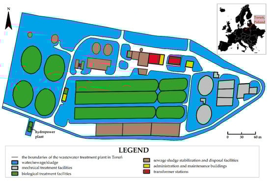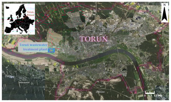 The “Centralna” municipal WWTP in Toruń was selected as a case study facility. It is in northern Poland, in the Kujawsko–Pomorskie voivodeship, in the western part of Toruń. It is a mechanical–biological WWTP with a maximum capacity of 90,000 m3/day. Taking into account data on annual amounts of wastewater from the period 2018–2022, the average was 15.56 million m3 and ranged from 15.15 million m3 in 2019 to 16.50 million m3 in 2021 (from 97.54% to 106.01% of the average amount of wastewater; normal years). This object treats domestic and industrial wastewater, infiltration, and stormwater from Toruń [51]. Its location is shown in Figure 3.