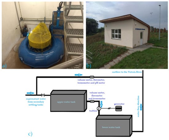 Figure 5a–c show photos of the turbine and the hydropower building and an illustrative diagram of the hydropower plant operation used in the WWTP.