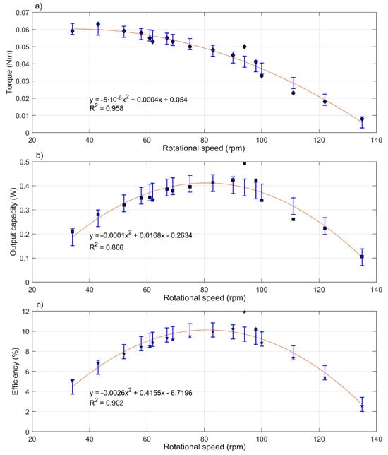 Relationship between turbine parameters in model conditions: (a) torque and rotational speed; (b) output capacity (power) and rotational speed; (c) efficiency and rotational speed; error bars equal the standard deviation between observed and estimated values; markers indicate recorded observations.
