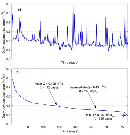 (a) Hydrograph of treated wastewater flow from the “Centralna” wastewater treatment plant in Toruń in 2018; (b) curve of treated wastewater flow duration sums in 2018 with identified characteristic flows.