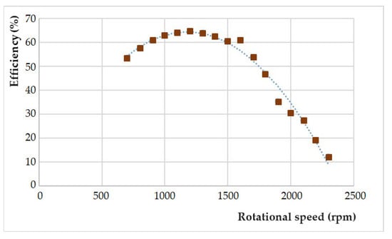 Thanks to the model tests, it was also possible to estimate the efficiency of the Francis turbine under simulated real conditions in a WWTP. Figure 8 shows the relationship between turbine speed and efficiency. The turbine started its operation at 700 rpm (30% flow utilization) with an efficiency of about 54% and reached its maximum efficiency at 1200 rpm (64.76%), then gradually dropped to an efficiency of almost 10% at 2300 rpm (100% flow utilization).
