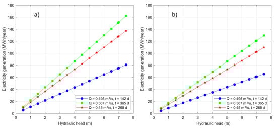Globally, there is great potential for the use of wastewater flow in WWTPs to generate electricity through hydropower plants; about 360 km3 of municipal wastewater is generated annually, of which 11.4% is treated and reused in WWTPs (equivalent equal 78,082.19 m3 s−1). Another 41.4% is treated and discharged to receiving waters (283,561.6 m3 s−1) [13]. For comparison, the average annual water discharge from the Amazon River basin ranges from about 10,000 to 225,000 m3 s−1 [14]. In 2022, total hydropower generation worldwide was 4326.76 TWh (Europe: 697.70 TWh, Poland: 2.06 TWh) [15,16]; assuming that an average of 82.8 m3 is needed to generate 1 MWh (example of U.S. gross electricity consumption for hydropower) [17], that is a total of 358.26 km3 of water. This means that wastewater has great potential for electricity generation: on average, similar to all the water used for hydropower worldwide in 2022, or 4347.77 TWh (estimated values). In 2020, the amount of municipal wastewater produced in Europe was 55 km3, the largest amount in Russia, Spain, and France (12.32, 5.68, and 5.12 km3, respectively), and in Poland—2.17 km3 [13]. The potential for electricity production from sewage in this region with the above assumptions was equal to 664.24 TWh (Poland: 26.21 TWh). The calculated values are indicative only and would require separate scientific research.