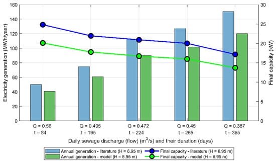 The article also performed the non-parametric Wilcoxon signed-rank test, comparing statistical significance between two groups of data based on the assigned sum of ranks, expressed by the z score (p < 0.05). The null hypothesis is that the differences in single-sample cases are distributed centered about zero. Absolute values are ranked [50]. In this case, these are paired model and literature data for the final turbine capacity (power) obtained and the annual electricity production depending on the hydraulic head.