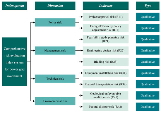 One of the primary risks to PGI is policy risk, and power-grid enterprises must adhere strictly to national regulations and laws. When macroeconomic policies are changed, enterprises must also change the direction of their investments. It is simple for enterprises to halt and restrict investment when it veers from or opposes policies. As a result, the risks associated with project approval (R11) and energy/electricity policy adjustment (R12) are chosen for this work [40,41]. Regarding the assessment of policy risks, experts mainly rely on whether the relevant policy documents issued contain similar content. The degree of risk mainly depends on the frequency with which the relevant content is mentioned;