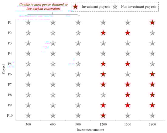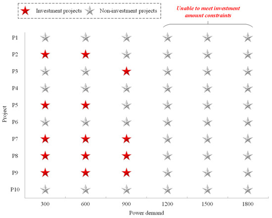 As shown in Figure 8, when the growth rate of electricity consumption is slow, the power demand constraint does not exceed 900; P7, P8, and P9 are essential investment directions, and P2, P3, and P5 can also be used as alternative solutions. However, when the power demand exceeds 1200, the existing investment amount is no longer able to support this constraint.
