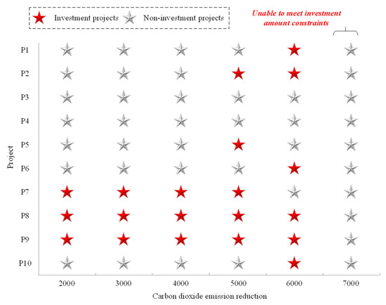 As shown in Figure 9, when environmental constraints are slack, P7, P8, and P9 are stable PGI directions. However, when environmental constraints are tight, it is difficult to continue the P7 project, which trades high investment for higher environmental benefits. When the carbon dioxide emission reduction constraint reaches 7000, the existing investment amount is difficult to support the achievement of environmental goals.